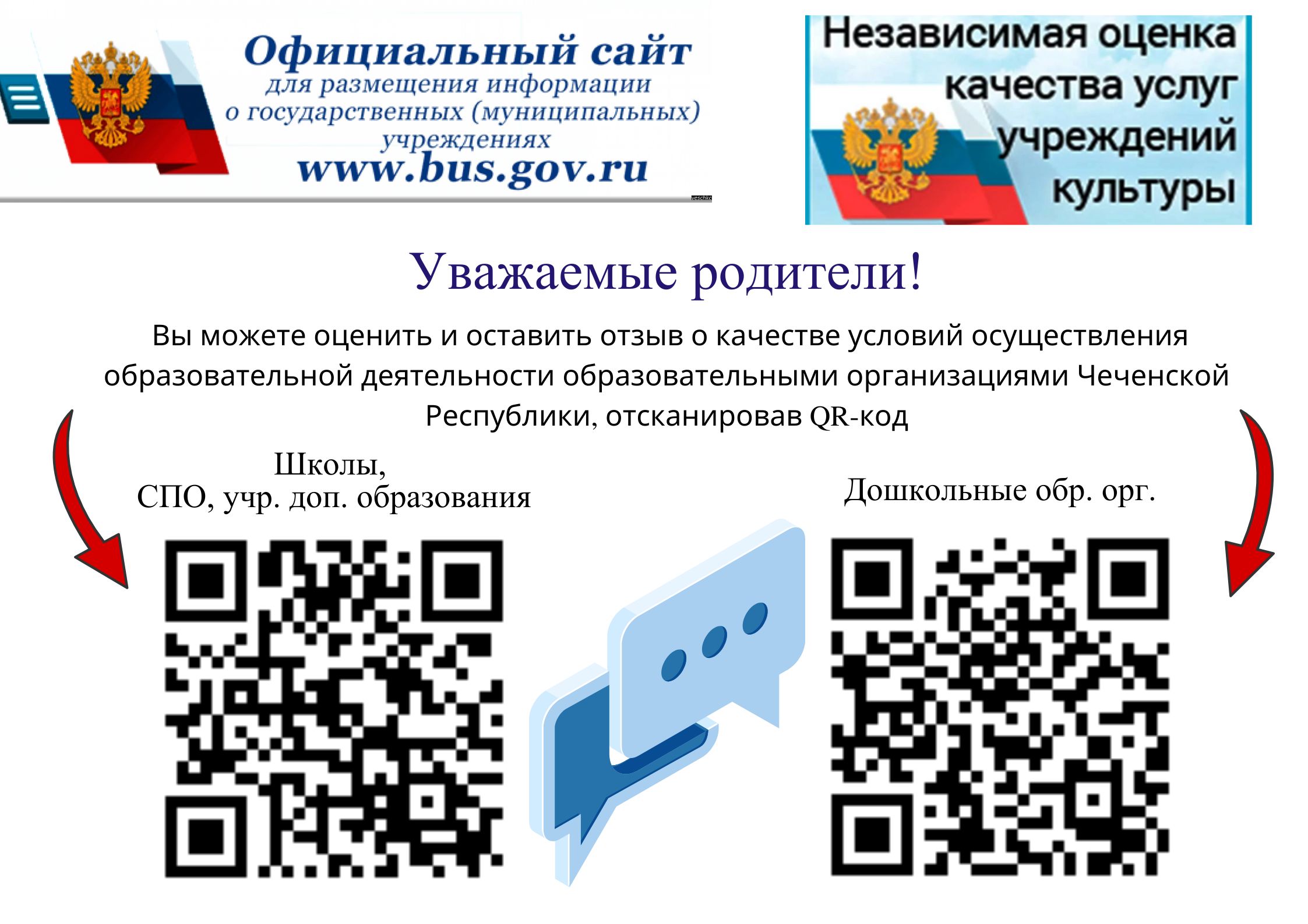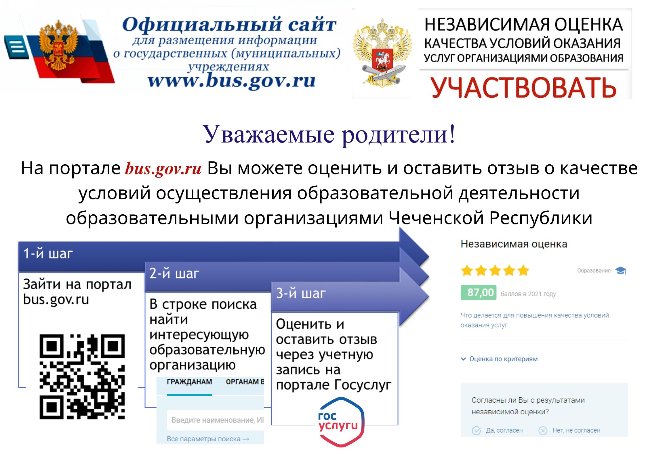 На портале bus.gov.ru Вы можете оценить и оставить отзыв о качестве условий осуществления образовательной деятельности образовательными организациями Чеченской Республики.